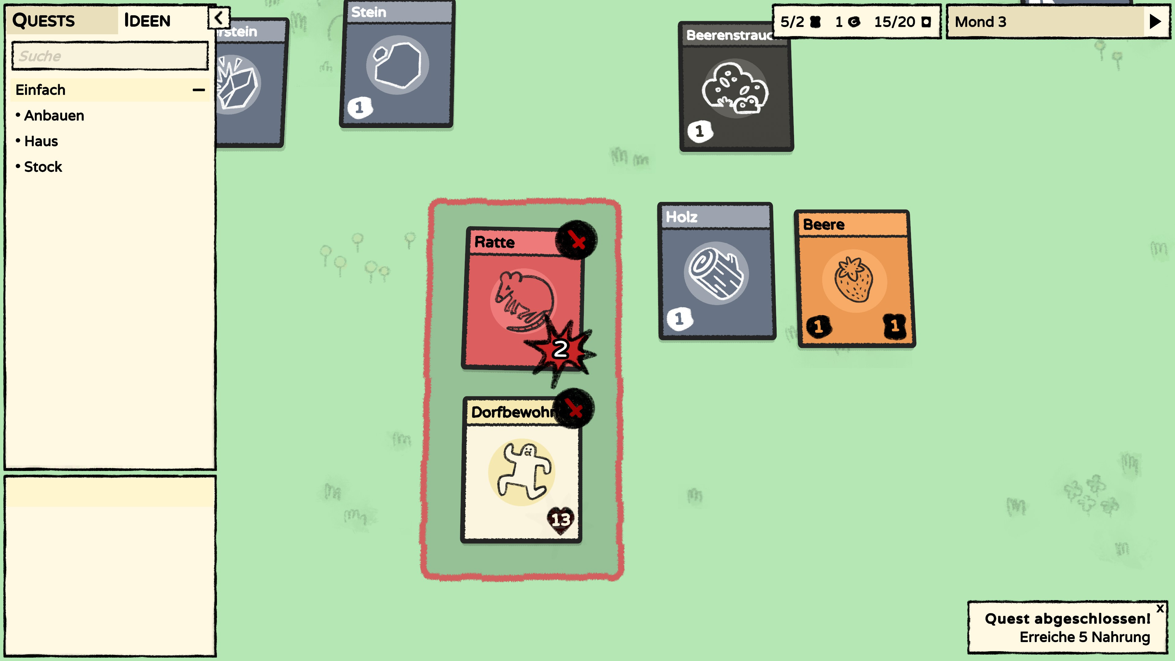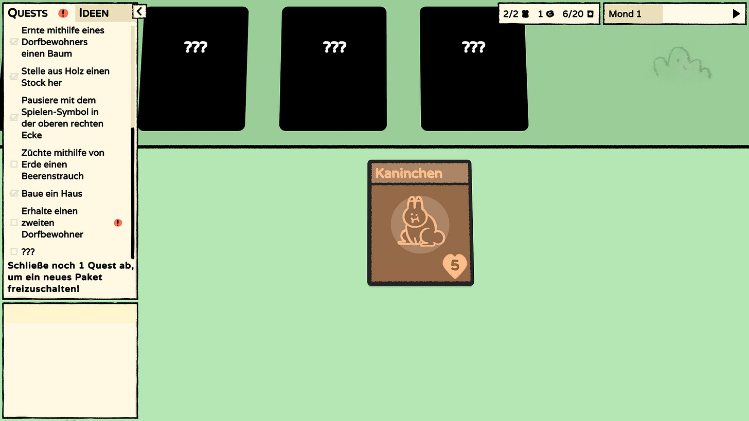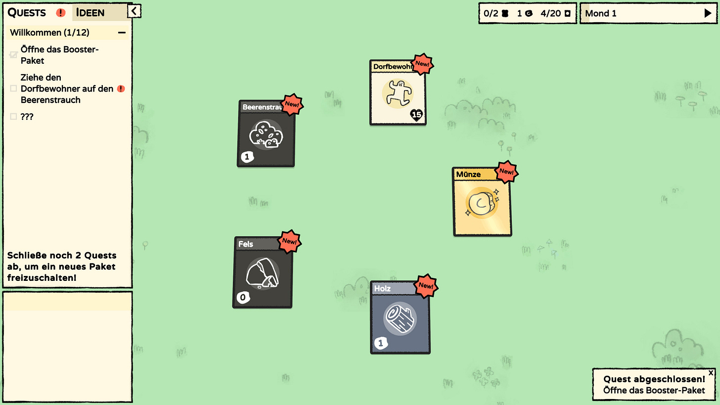 This didn’t feel like a problem in Stacklands, however, because the quest objectives were exclusively German, which meant I had to understand both the verb it was commanding me to do as well as the noun (the card) it wanted me to do it too.